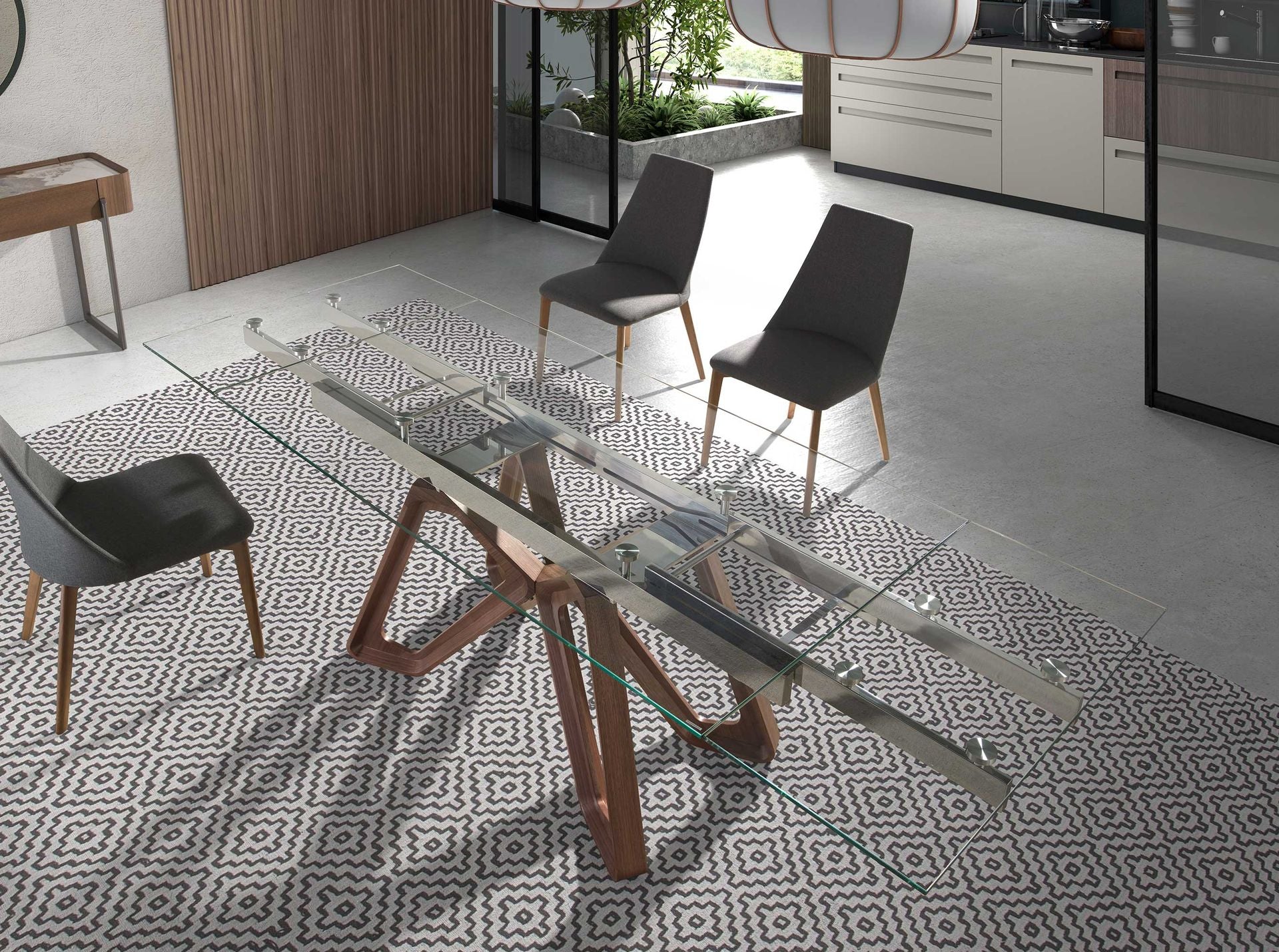 Een subtiele en elegante tafel is de Japandi Eettafel Yasuma ™. Door de prachtige vorm van de poten, uitgevoerd in walnoothout krijgt het een warme en sfeervolle uitstraling. De uitschuifbare glasplaat is van gehard gepolijst glas en is 10mm dik. De transparantie van het glas onthult het uitschuifbare openingsmechanisme van deze tafel, wat het ontwerp zeer uniek en innovatief maakt.