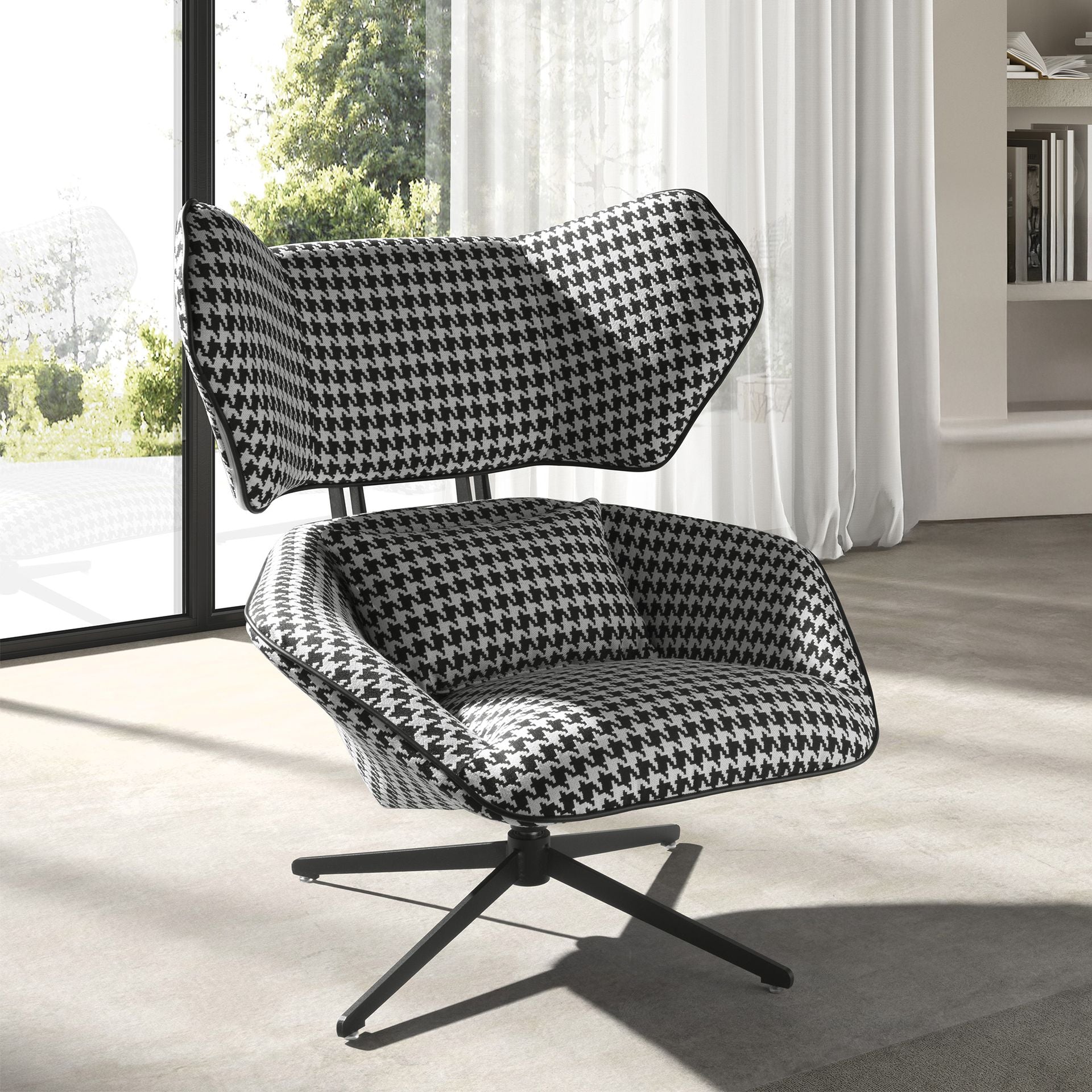 De Japandi Fauteuil Shido ™ trekt direct de aandacht door zijn karaktervolle uitstraling. De zwart-witte stof met subtiel patroon geeft het ontwerp een speels accent. De royale vorm zorgt voor een zachte uitnodigende uitstraling, terwijl het zwarte stalen onderstel een modern fundament toevoegt. Een fauteuil die een echte eyecatcher is in jouw interieur.